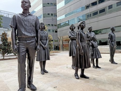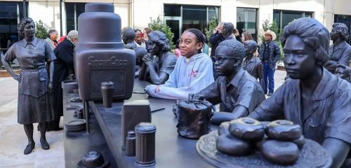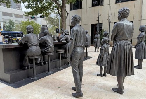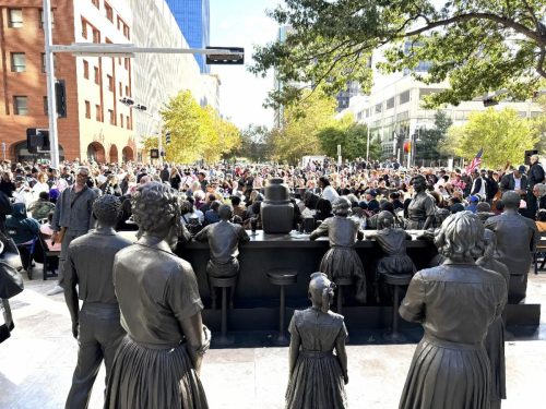 On November 1, StudioEIS unveiled Clara Luper National Sit-In Plaza in Oklahoma City, OK. The multi-figure piece depicts the events of August 19, 1958, when 13 students from the NAACP Youth Council (ages 5-17) and their teacher, Clara Luper, a member of the NAACP and Civil Rights activist, took seats at Katz Drug Store and asked to be served. Denied service, they sat without speaking for three days as they were spat on and cursed at, but after returning for a third day, Katz began serving them ending segregation at the 65 Katz Drug Stores in five states. The installation, which contains 14 figures and took 4 years to create, is in downtown Oklahoma City. On hand for the event were Oklahoma City Mayor David Holt and 10 of the original sit-inners.